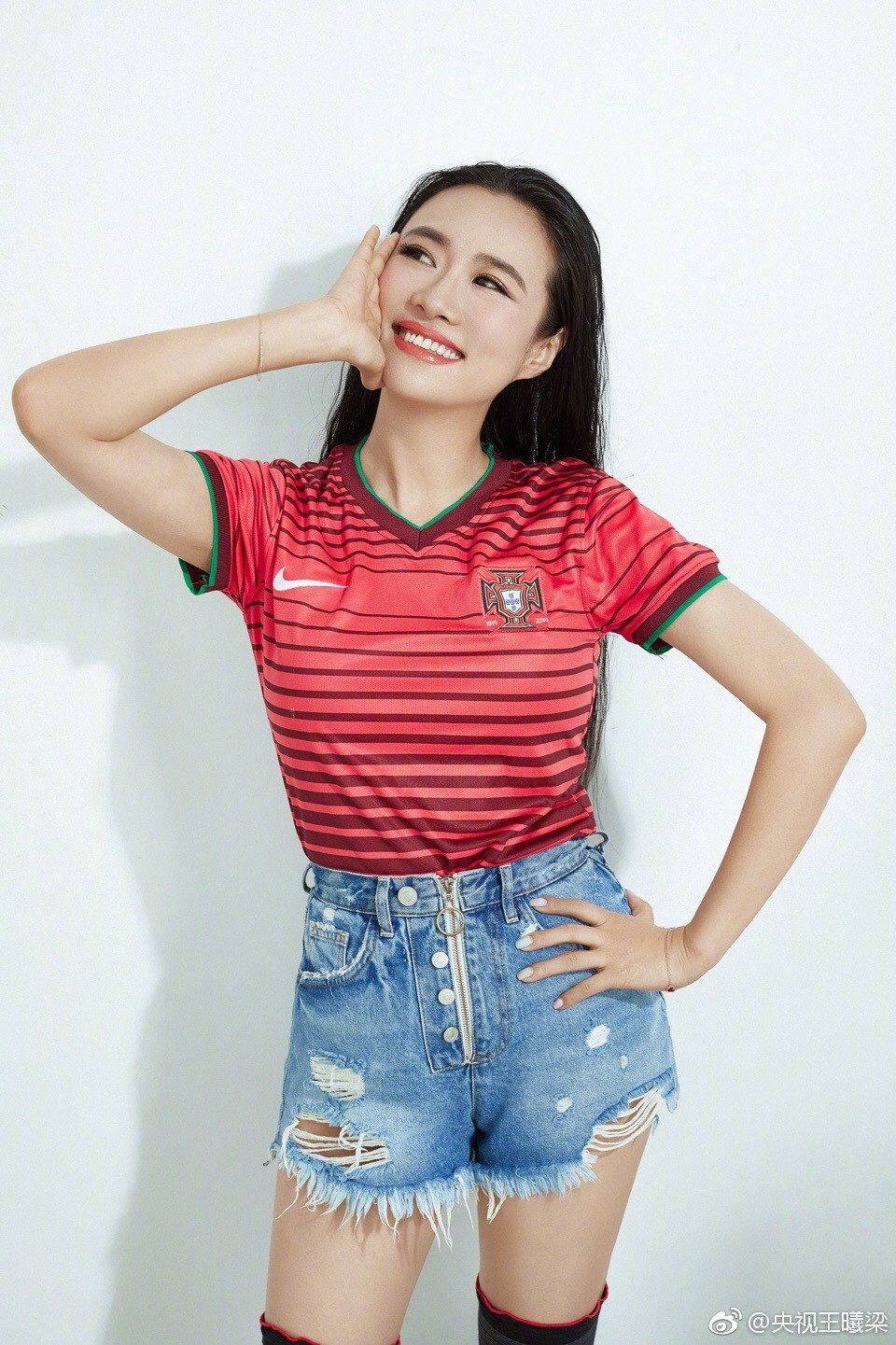 这组写真展现了王曦梁对足球运动的热爱与独特的时尚诠释。她身着一件经典的蓝色足球训练上衣,搭配利落的牛仔短裤,将运动活力与日常时尚完美融合。最引人注目的是那双亮眼的橘色丝袜,不仅大胆地突破了传统运动装的色彩框架,更与她脚下简洁的白色运动鞋一同,衬托出健康修长的腿部线条。这让人不难理解为何她会被观众和媒体亲切地称为“央视第一美腿”和“天足大长腿”。写真中的她,或手持足球嫣然浅笑,或奔跑跃动充满力量,每一帧画面都洋溢着阳光与健康的气息。